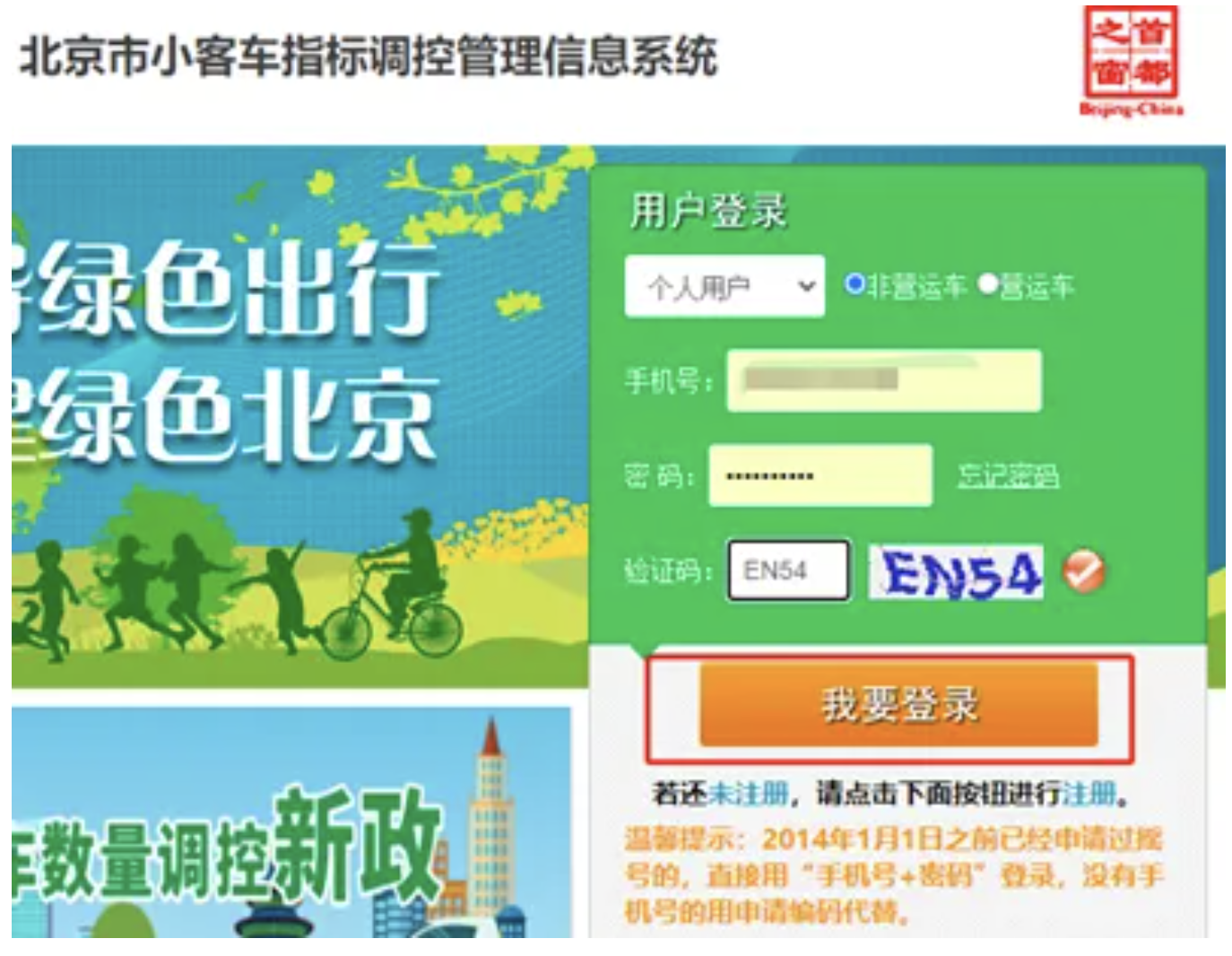 第一步:打開北京市小客車指標調控管理信息系統,輸入手機號、密碼后,點擊【我要登錄】按鈕,登錄系統。