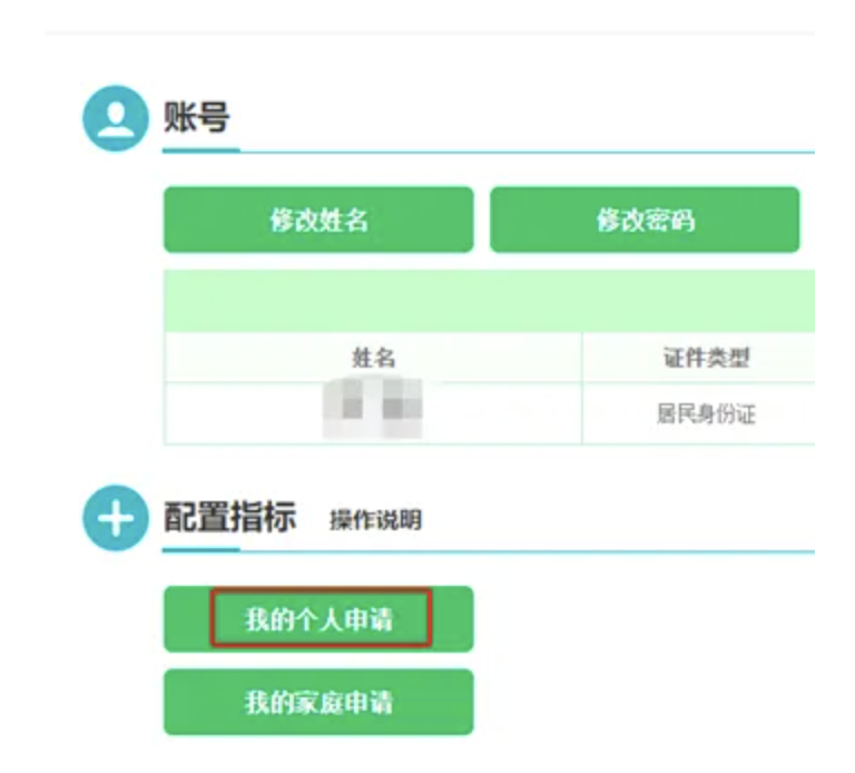 第二步:進入用戶中心后,在配置指標中,可以看到有【我的個人申請】和【我的家庭申請】,這里以個人申請舉例。點擊【我的個人申請】按鈕,進入個人小客車配置指標申請表結果頁面