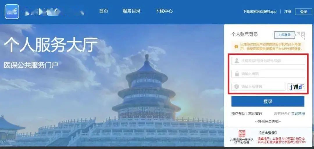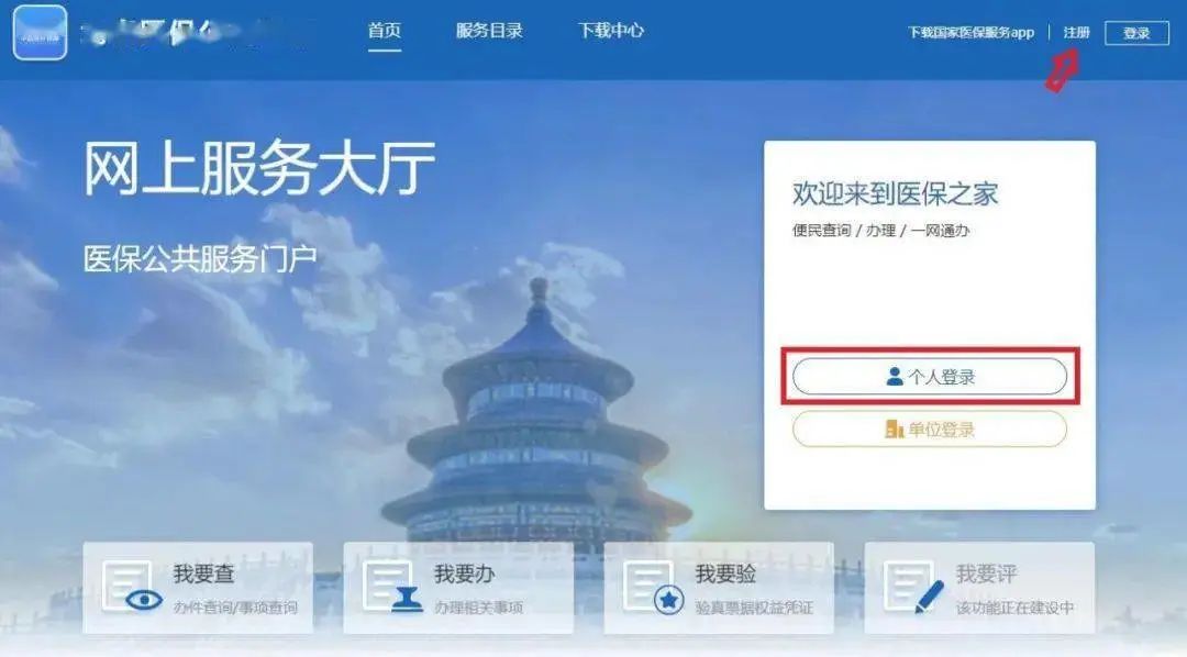 1、登錄“北京醫保公共服務”網上服務大廳,選擇【個人登錄】進入個人賬號登錄界面;如您首次登錄,請先點擊【注冊】進行個人賬戶注冊。
