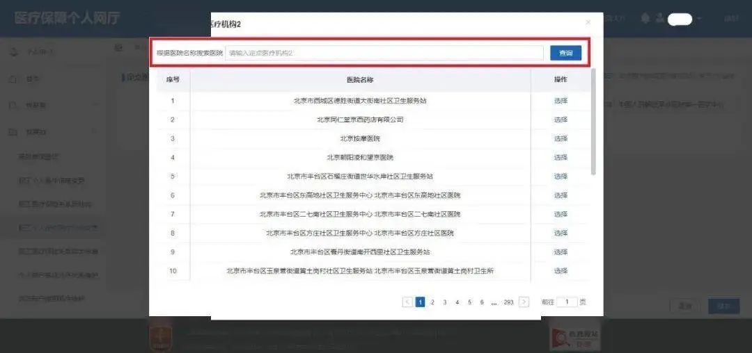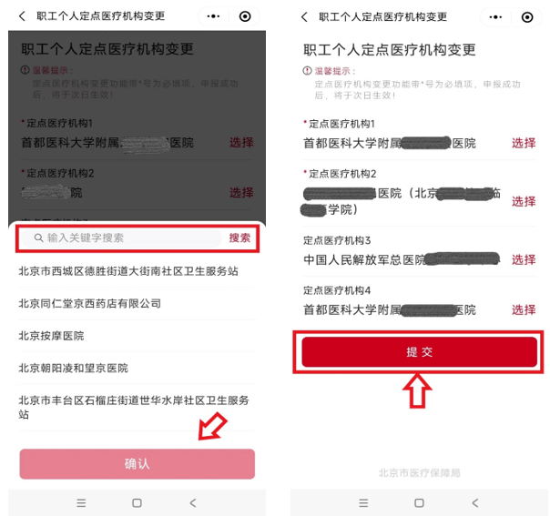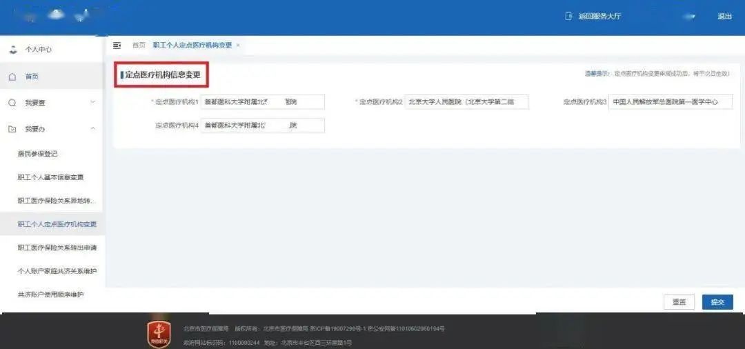 3、點擊需要變更的定點醫院后,輸入新選定的定點醫院,更改后點擊【提交】。