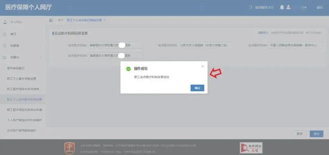4、提交成功頁面會顯示【職工定點醫療機構變更成功】,最后點擊“確認”完成變更業務。